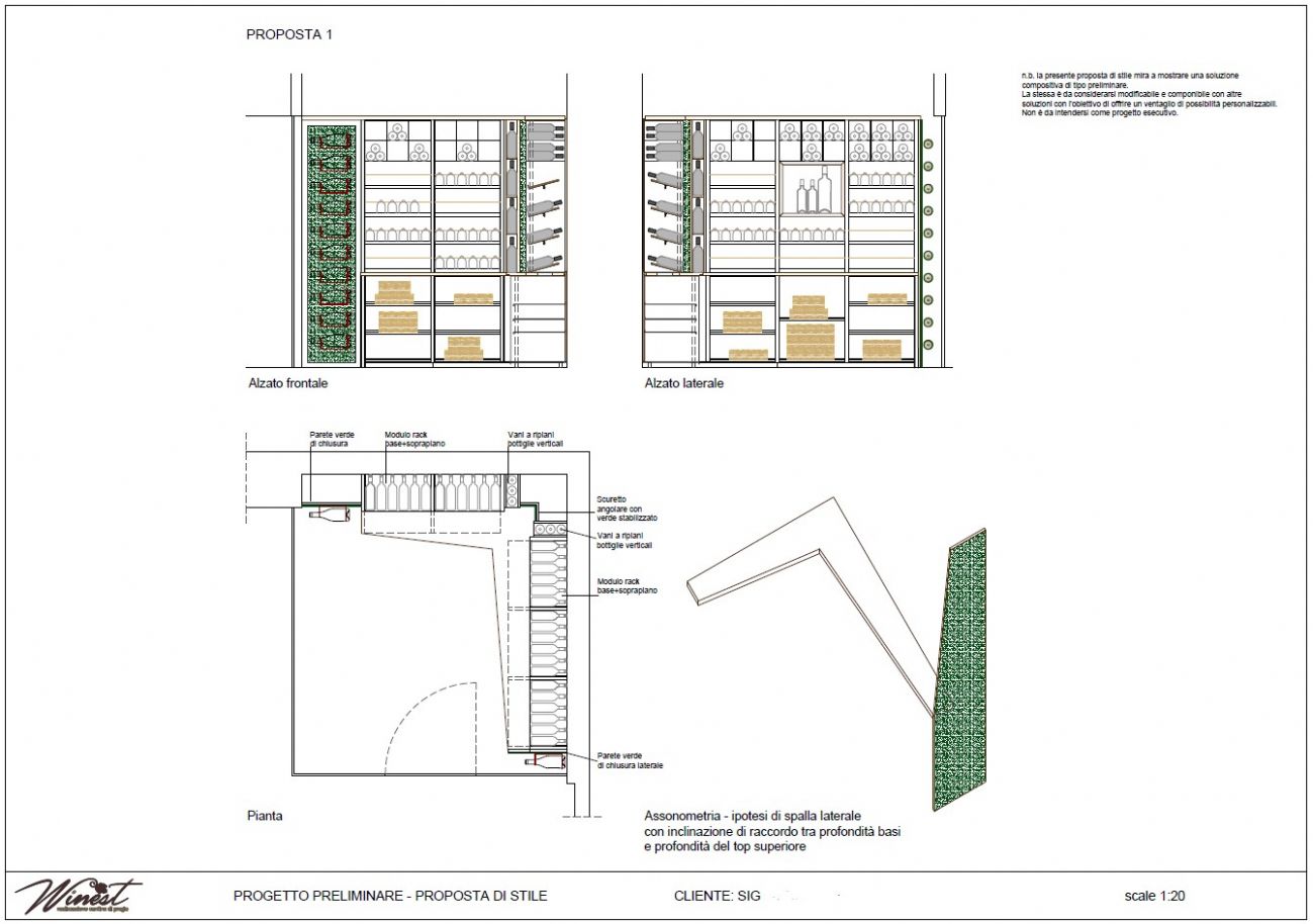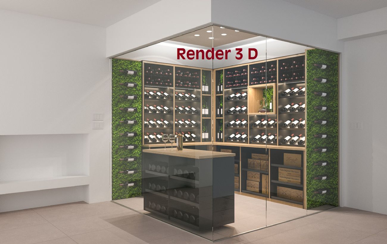 La progettazione ha previsto l’integrazione di moduli portabottiglie su misura in legno e metallo, capaci di combinare ordine, accessibilità e impatto visivo. Le diverse configurazioni di stoccaggio – esposizione orizzontale, vani per casse in legno e spazi dedicati alle bottiglie di grande formato – permettono una gestione efficiente e organizzata del vino.