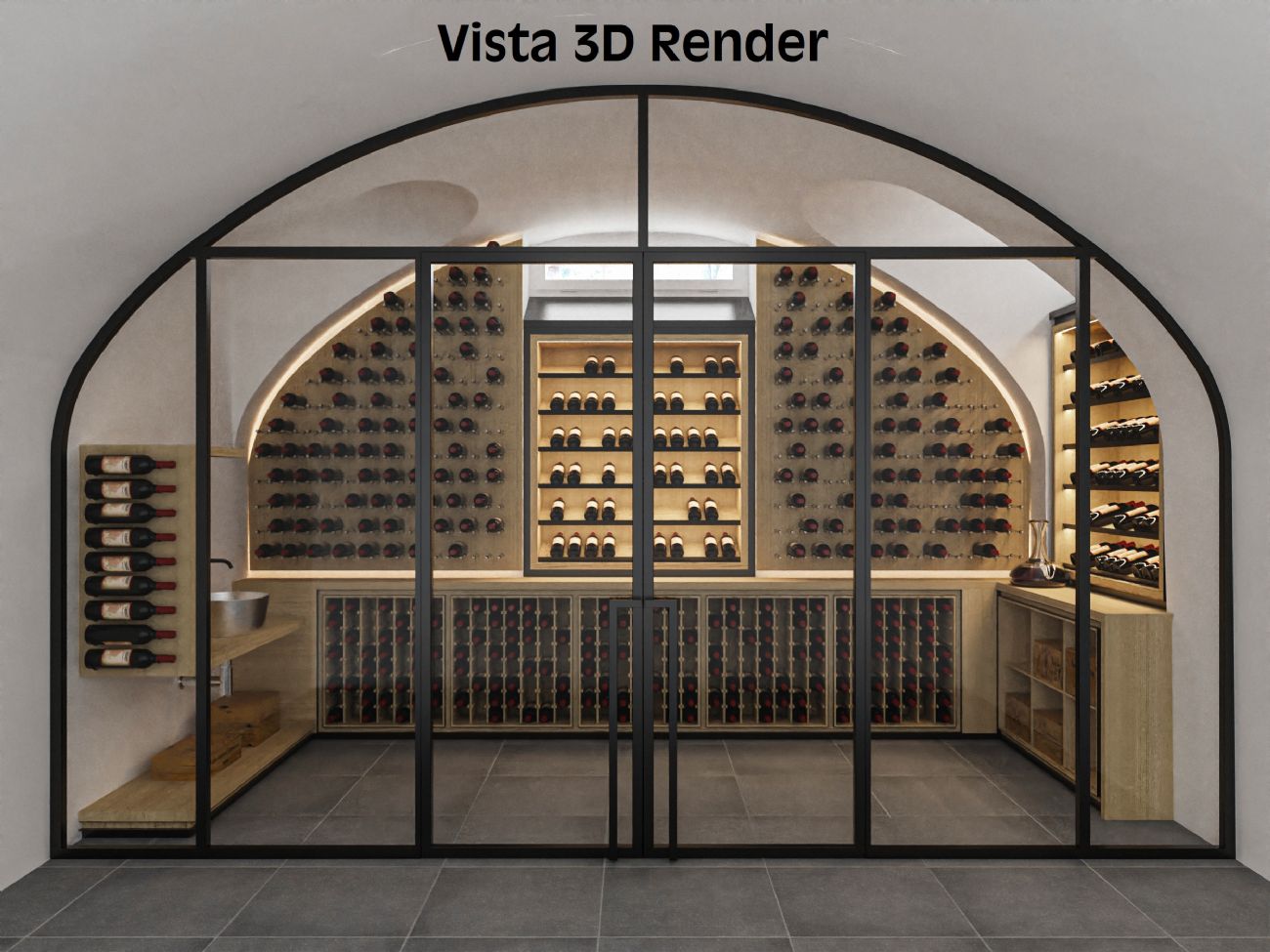 Il serramento in acciaio, dal profilo leggero e preciso, sostiene il peso del vetro temperato garantendo isolamento termico e continuità estetica. La sua curvatura segue perfettamente la sagoma della volta, evidenziata dalle due pareti portabottiglie retroilluminate che disegnano un arco di luce.